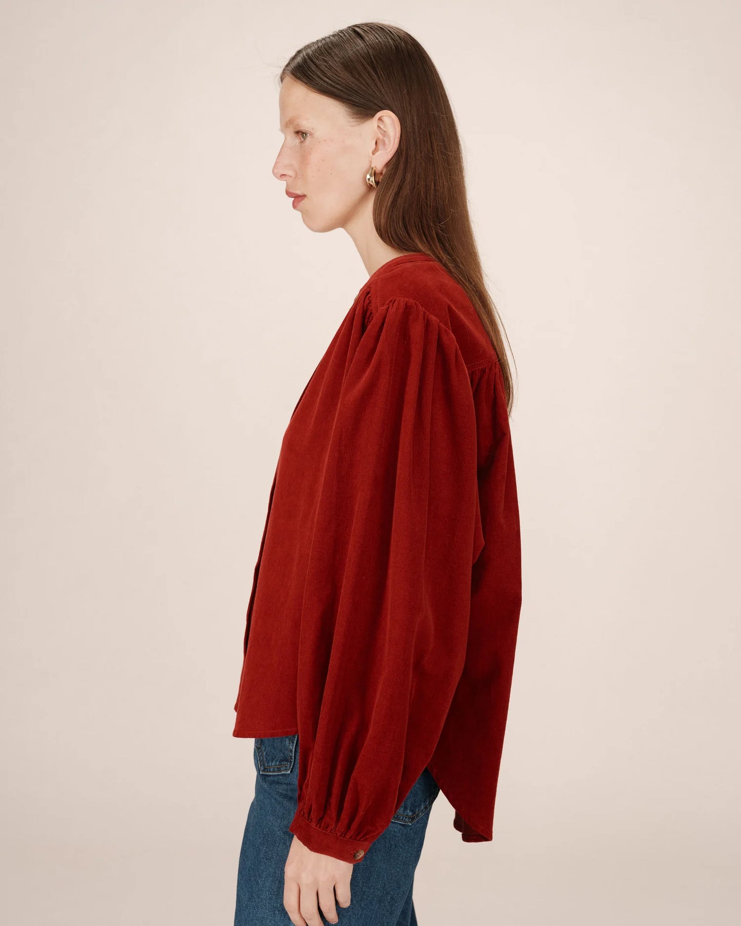 La blouse oversize SURI est confectionnée en velours côtelé 100 % coton, alliant confort et style rétro. Les manches longues bouffantes, soulignées par des poignets boutonnés, apportent une touche de volume délicate. La blouse en velours SURI présente des fronces aux épaules et à l'empiècement dos, créant un jeu de textures élégant.