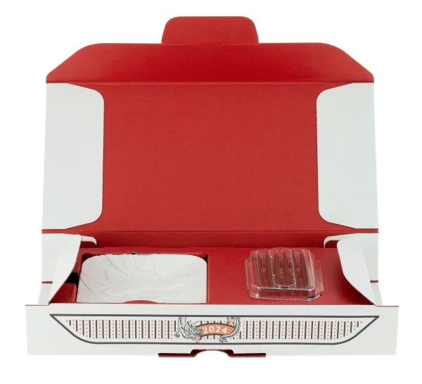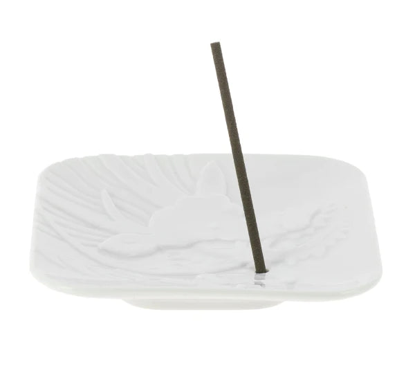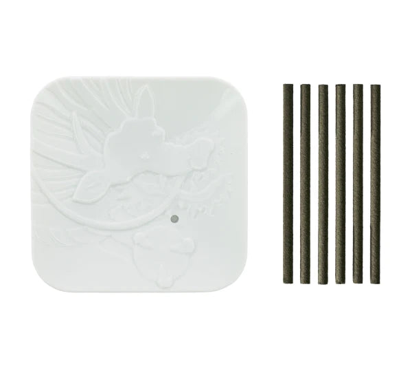 Étui cadeau en carton avec 6 bâtonnets d'encens en bois d'agar et un porte-encens en porcelaine 8 x 8 cm.
